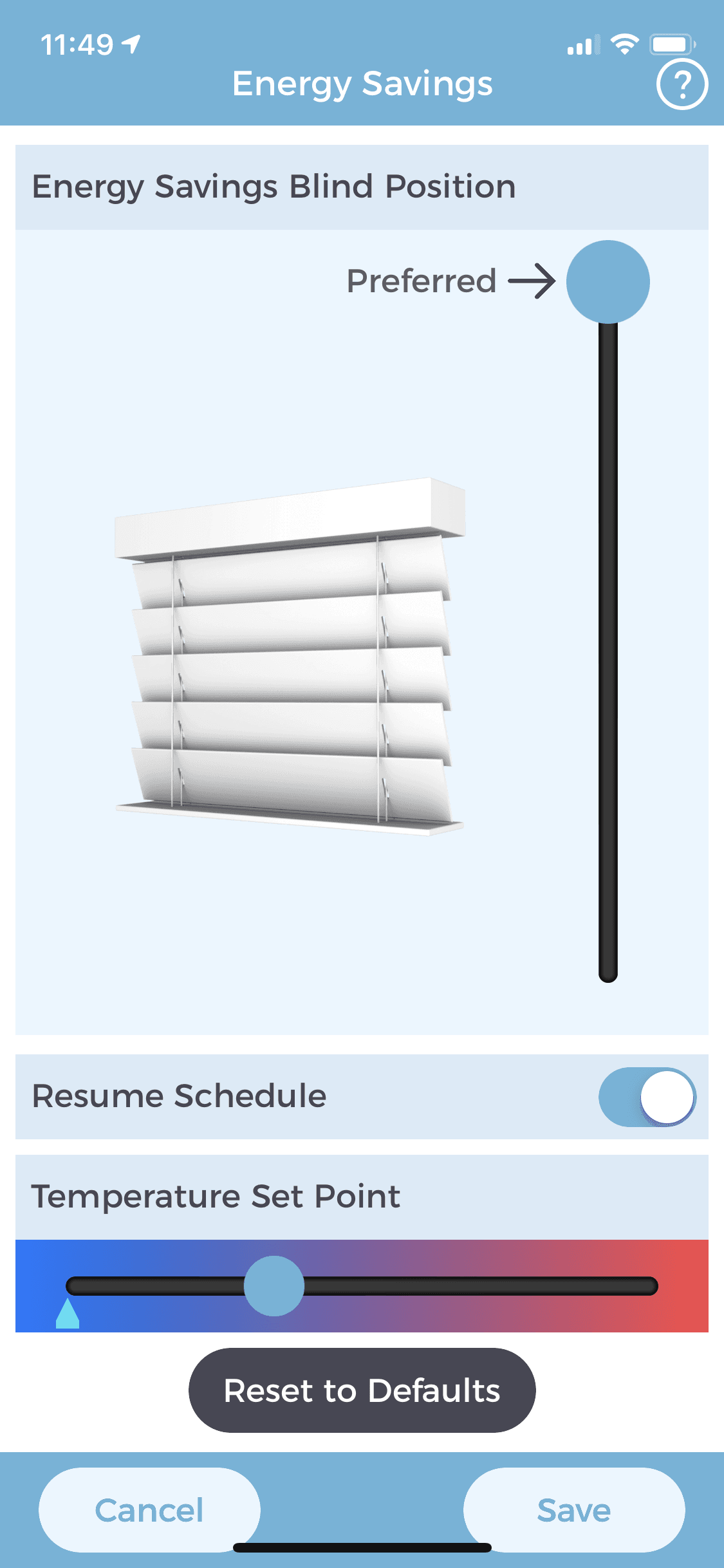 The blinds also offer an Energy Savings Mode, which will close the blinds when the room temperature exceeds a customizable threshold, and re-open the blinds when the room has cooled off.