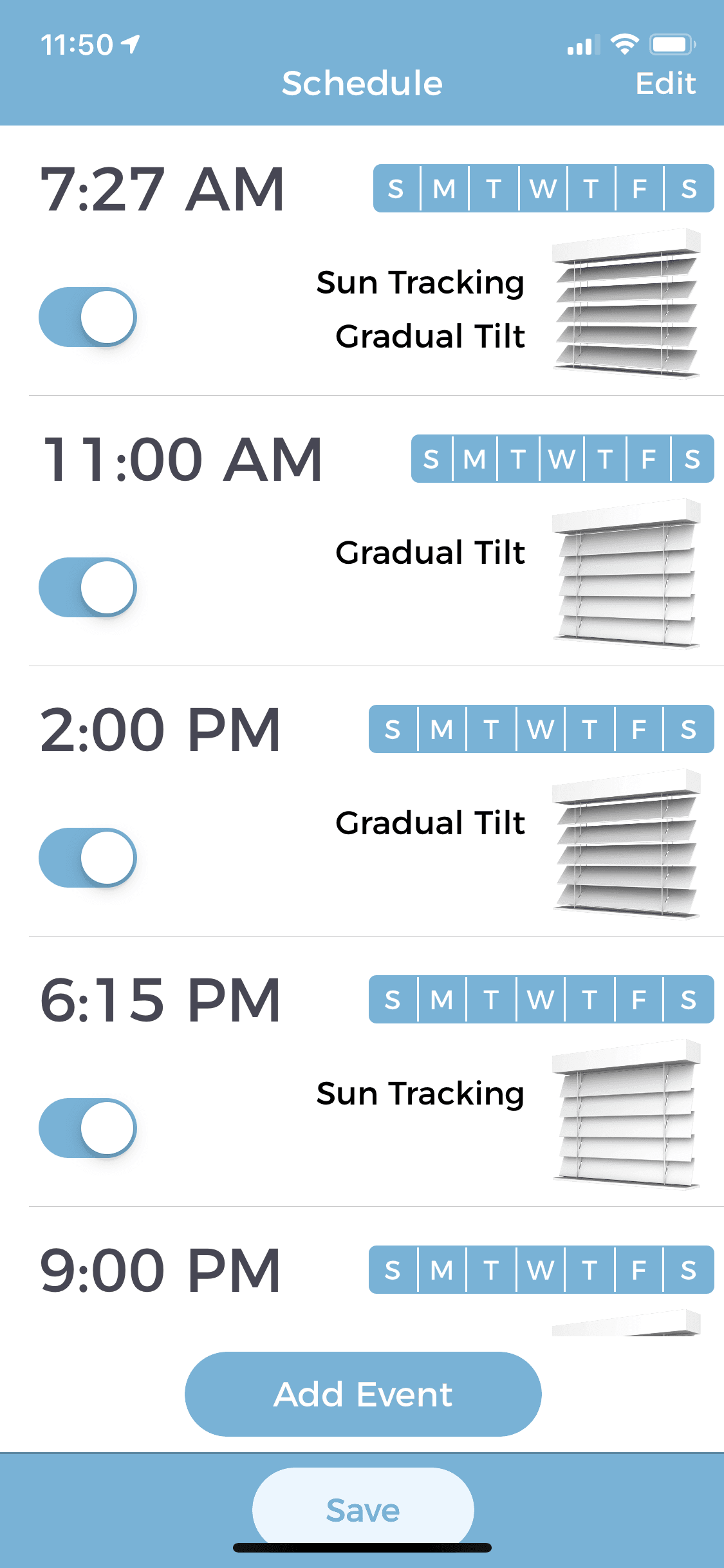 Each room setup can have a custom schedule, to open, close, or adjust the blinds at any specified time. Users can choose which days to apply the schedule, and if the trigger time should adjust as the seasons progress (pretty cool!).