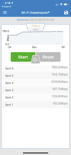 Wi-Fi Sweetspots is a free iOS app that offers persistent signal speed metrics while you move around holding your phone. The app also has an audible tone-indicator, which can be turned on and off, that varies in pitch to indicate signal strength. To toggle this feature, tap the speaker icon located between the Start and Stop buttons.