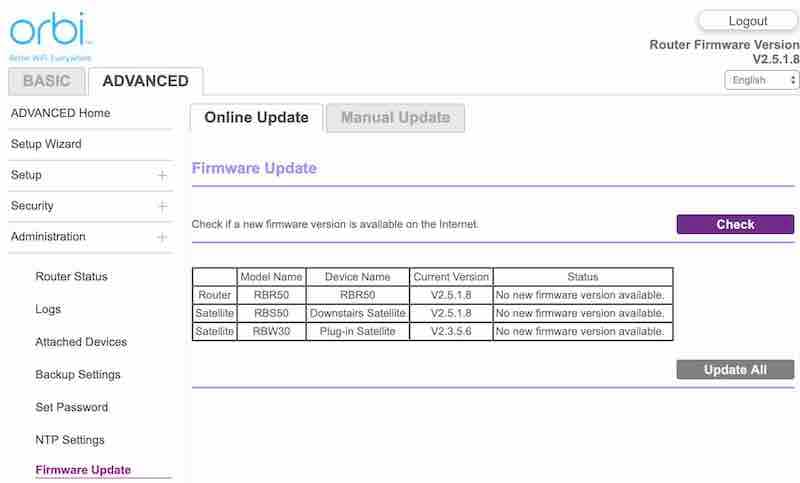 To check or update your Orbi's firmware, go to Advanced > Administration > Firmware Update. You can check if an update is available, without actually installing it, from this Advanced menu.